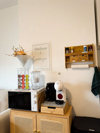 Une cuisine avec accessoires (taque, évier, micro-onde, Dolce Gusto, frigo)